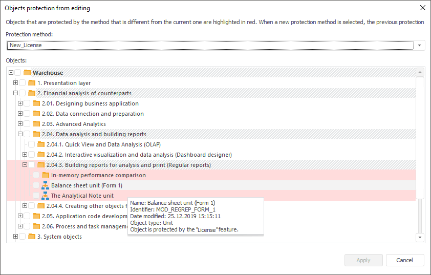Repository objects can be protected from editing with application feature that is not included into standard features of Foresight Analytics Platform and this feature is ordered and generated aside. Further the obtained application feature is not provided to clients.