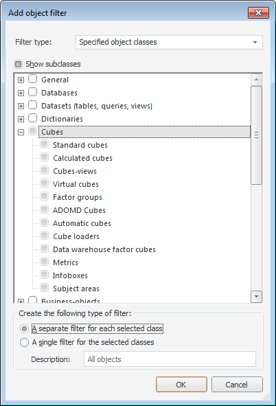 In the class tree, select object classes, which are available when this filter is used. Use the Show Subclasses checkbox to disable displaying of additional object classes in the tree.