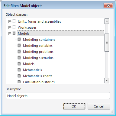 The dialog box can be used to change the object class (subclass or their combination for a composite filter), for which the filter is created, or modify filter description. Clicking the OK button saves the changes.