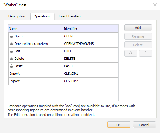 The table displays standard operations by default. Their names and identifiers are prohibited to edit.