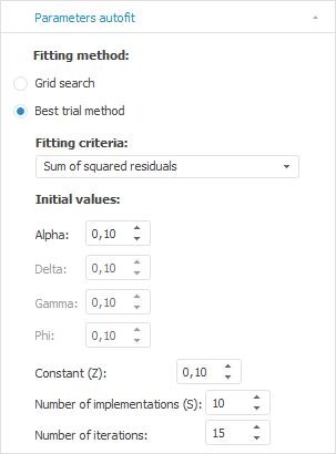 To set up autofit coefficient values parameters in the exponential smoothing model, use the Parameters Autofit tab on the side panel.