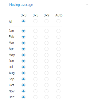 Irrespective to the calendar frequency the tab contains the following radio buttons determining the moving average calculation method: