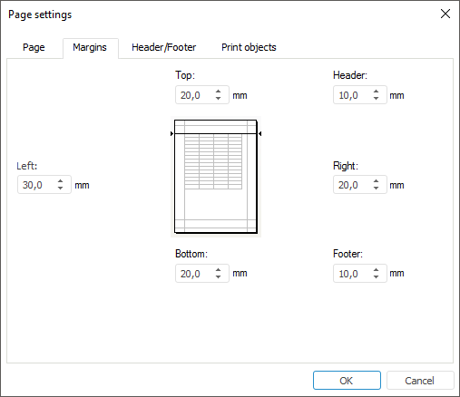 In the Header and Footer value editors, set the interval between the header and the page top edge and between the footer and the page bottom edge. This interval must be less than the size of the bottom and top margins.
