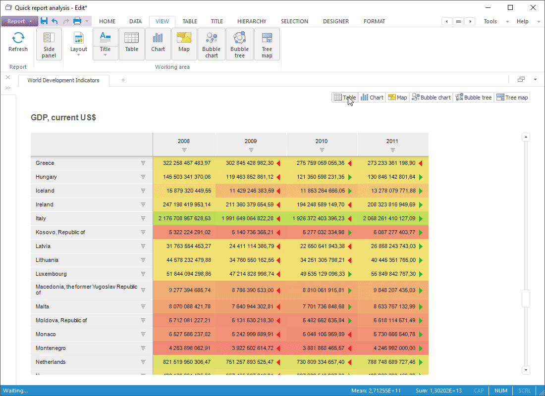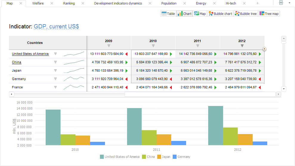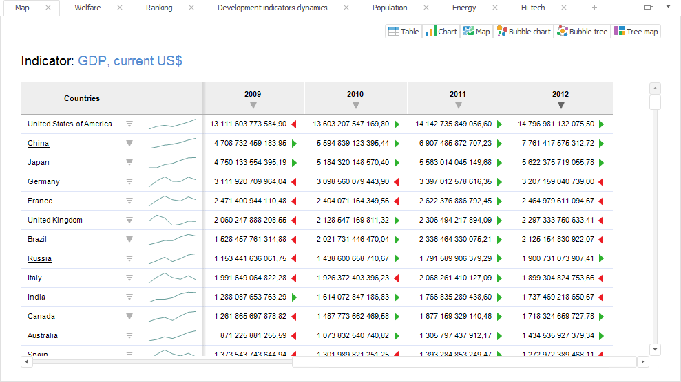 Table. It is a spreadsheet based on the data source from platform repository. A data cube generally can contain any number of dimensions. To view the cube as a table some dimensions are fixed, each of them determines an element for creating a data slice. Data slice is a two-dimensional data table, which heading and sidehead show elements of cube dimensions arranged by columns and rows.