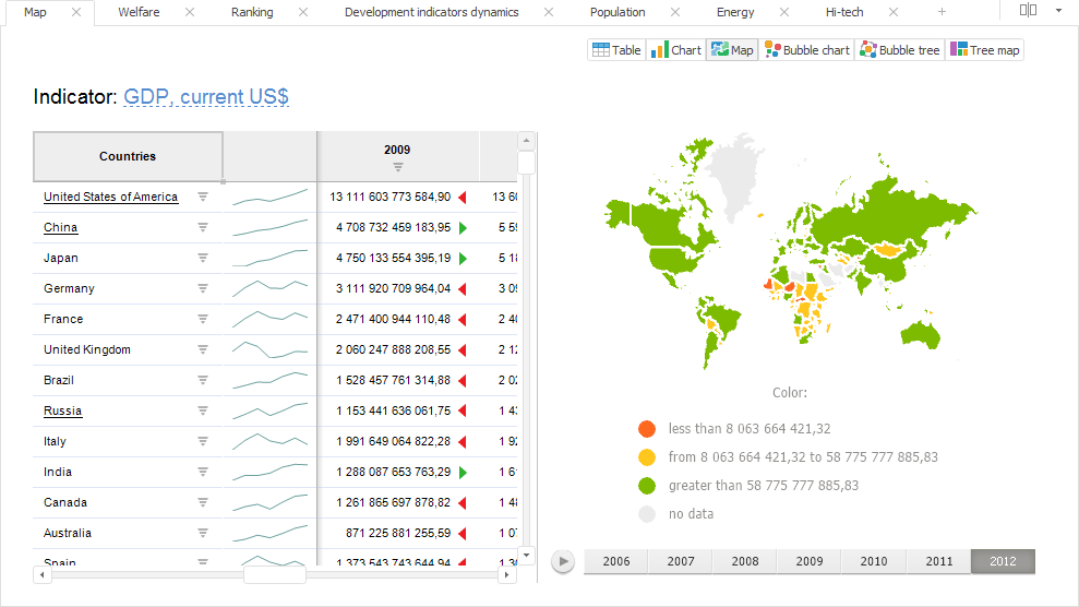Map. It is based on a two-dimension table and usually consists of one row or column from this table as territory fill. Territory fill is determined by start and end colors, which correspond to minimum and maximum values on the map. Colors of intermediate values are calculated automatically.