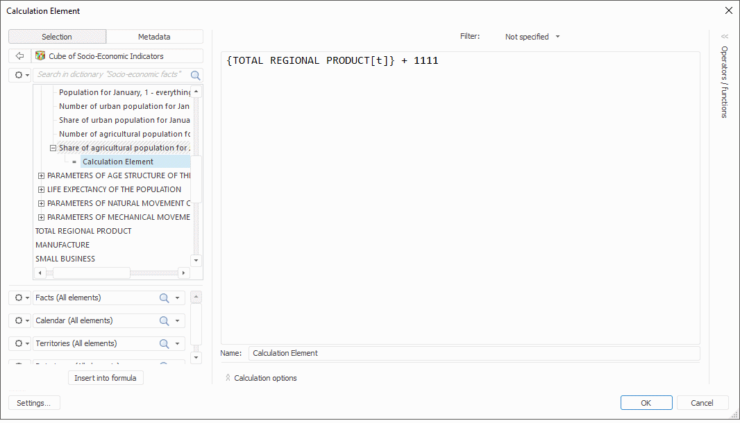 After clicking the Button2 button a dialog box of expression editor for regular report calculated element opens, which contains the element formula that can be edited: