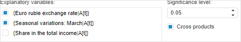 Cross Products. Selecting the checkbox enables the use of both the existing explanatory series and their cross products. For example, the S1 and the S2 series are considered. Using the cross products, the following regressors are considered: S1*S1, S1*S2, S2*S2. It is not recommended to include cross products if the number of explanatory variables (regressors) is large.