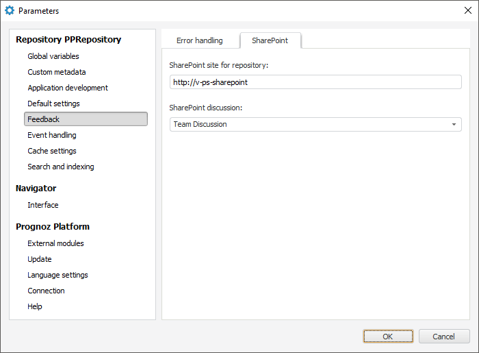 Repository parameters for publishing report discussion in SharePoint portal are set up on the SharePoint tab in the Feedback section of the Parameters dialog box.