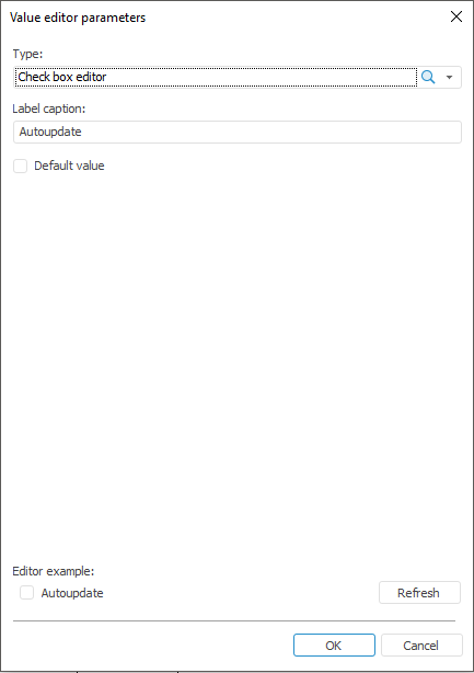 Default Value. Determine the editor value to be displayed by default. This value must be in the range of available values determined for the editor. If the range of available values for the editor is not set, the value must be in the range [-5.0 x 10-324; 1.7 x 10308].