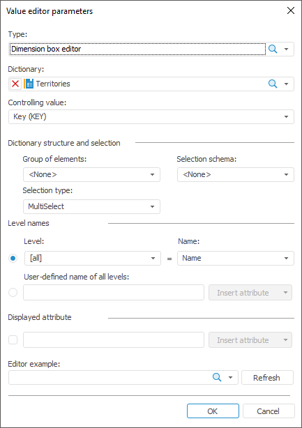 Controlling Value. Use the drop-down list to select a dictionary attribute that is used to transfer a value to parameter. For example, the dictionary displays element names, and parameter takes integer values. In this case the parameter will definitely need to take values of the Identifier attribute. By default the Identifier(ID) attribute is used.