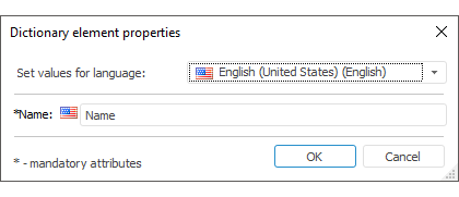 So, the multilingual MDM dictionary will be created. Work with elements of such dictionary is the same as with elements of simple MDM dictionaries. The difference is in inputting values for string attributes for elements: it is required to select the language for which value will be applied.