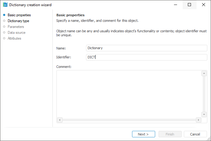 The Basic Properties page is used to specify the object name, identifier and comment.
