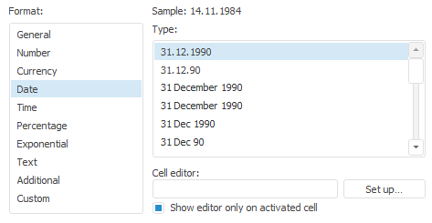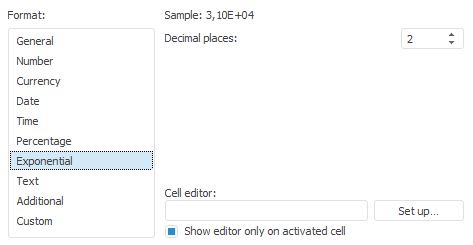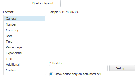 The tab contains the list of predefined formats for displaying sheet cells contents. Select required data format and set its parameters. Tab appearance and settings depend on the tool in use.