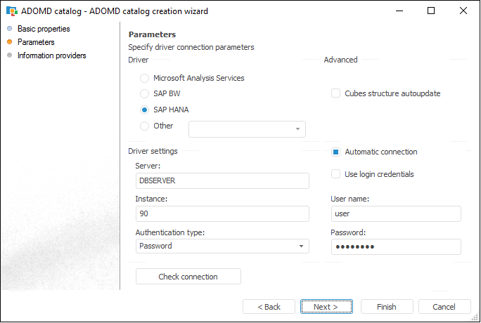 Click the Check Connection button. If connection is successful, click the Next button to go to the Information Providers page. On this page one select catalogs or information providers, and ADOMD catalog objects are created based on their information. By default, the All element is selected, all cubes created on server are created. If required, the list of created elements can be reduced, to do this, select required catalogs or separate information providers. The list of selected elements is saved, on updating the ADOMD catalog contents the information only about selected elements is updated.