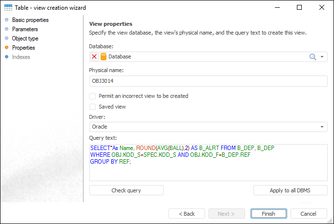 On the View Properties page select the database, to which the view, the view's physical name and view query's text are added: