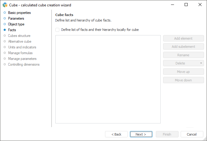 To create a local fact dimension, select the Define List of Facts and Their Hierarchy Locally for Cube checkbox. Then add elements using the Add Element and Add Subelement buttons. Elements can be renamed and deleted using the Rename and Delete buttons respectively.