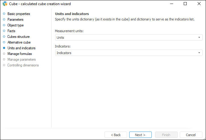 Select the dictionary in the drop-down lists that contain all existing cube dictionaries. These dictionaries must have a certain structure: Units and Indicators. If the structure of the selected indicators or units dictionary does not satisfy the required conditions, a warning message is displayed.