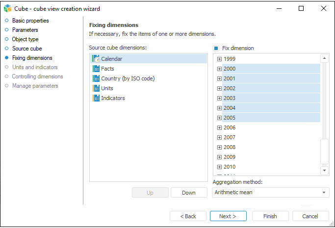 Multiple element selection becomes available after an aggregation method is selected in the Aggregation drop-down list. The aggregation of fixed dimensions with the use of the specified method is applied for selected elements.