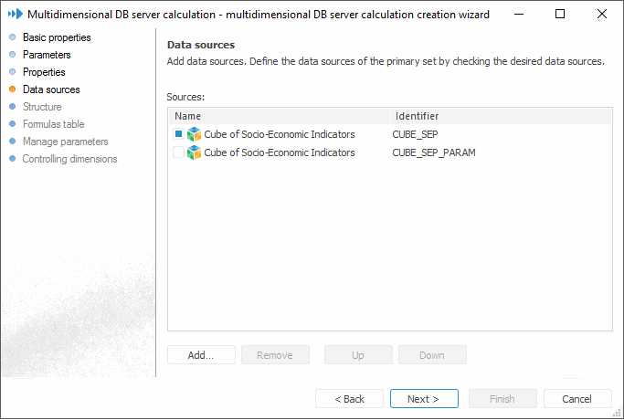 To determine data sources of multidimensional calculation on DB server and their primary set, go to the Data Sources page.