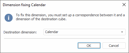 A dialog box opens for source cube dimensions. Select the required dictionary of the destination cube to establish a correspondence: