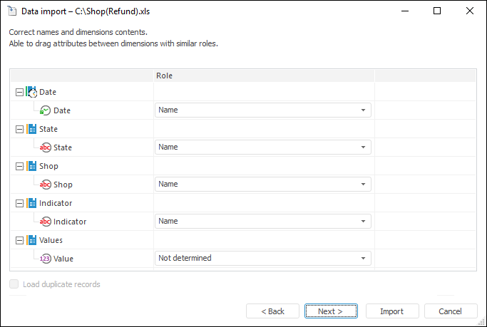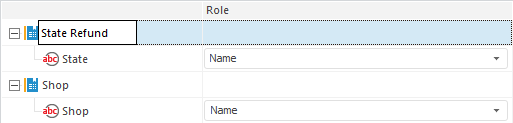The Name role. Values of fields with the Name role are imported as names of elements. If this role is set for several attributes, hierarchical dimension is created. Arbitrary hierarchies such as SHOP-STATE can be organized using this role. Merging with calendar dimension is forbidden.