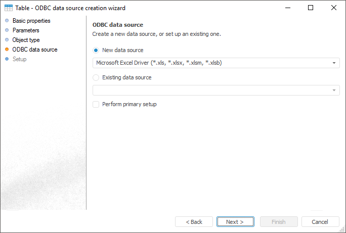 After executing one of the operations, the general table creation wizard opens. Select the radio button next to the ODBC Data Source item on the Object Type page. Go to the next wizard page. The dialog box opens: