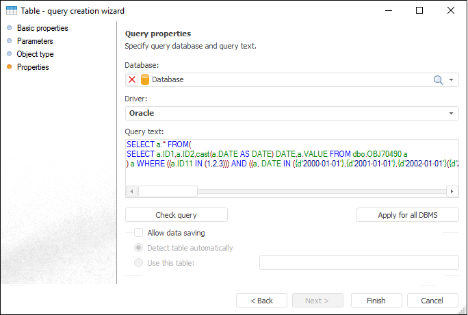 To finish wizard's work, click the Finish button, after which the query is saved. The following actions are executed on saving a query: