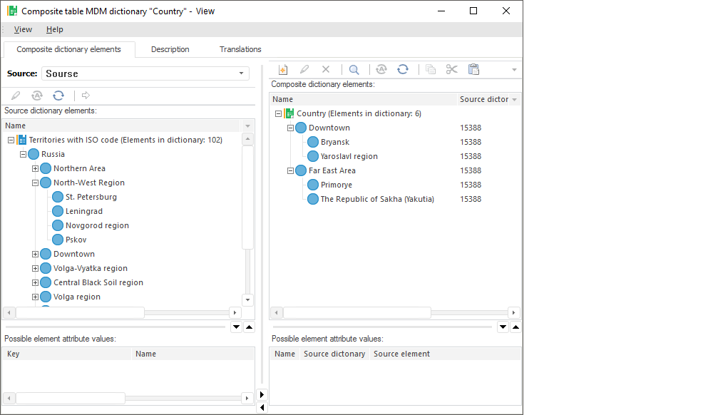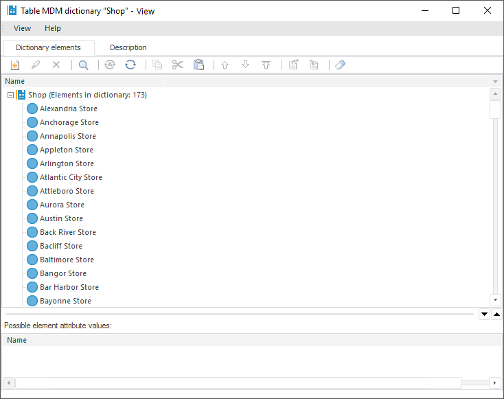 Table MDM Dictionary. The dictionary is used for creating a structured data presentation with possibility of its transformation. Creating a dictionary does not require a data source. Data can be entered manually or loaded from the data source to the dictionary by means of the built-in ETL tools. Dictionary elements may change in time, that is, may have several versions. Table MDM dictionary can be created in any place of repository, not only in the MDM repository. A table MDM dictionary that uses a single table to store data. A table is created automatically on creating a dictionary and is the dictionary child object. The table fields correspond to the dictionary attributes. Creating a table MDM dictionary requires a database to store dictionary data that is located outside the MDM repository: