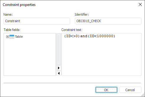 On the Table Constraints page, a list of constraints of the table fields is created. Constraints are used to control data stored in the table automatically. For example, the sum of cache money cannot be negative or loan issue date must be later than the date of bank foundation.