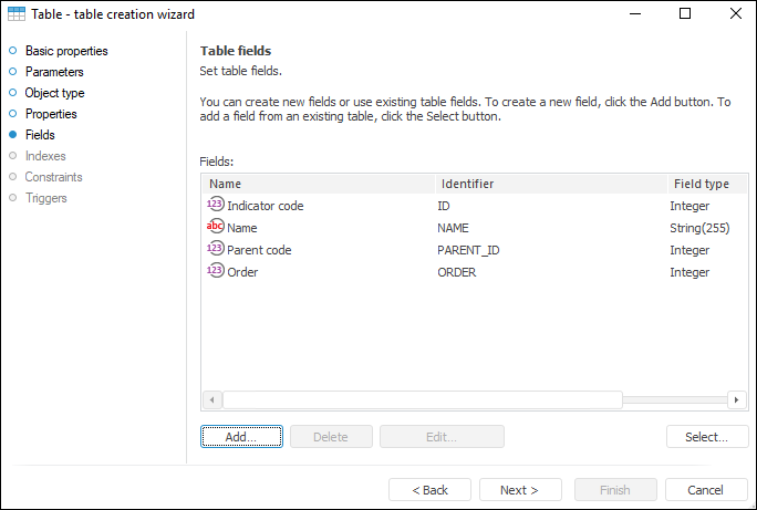 On the Table Fields page of the table creation wizard determine the structure of the table to create, that is, the list of table fields and their properties is created.