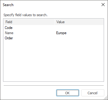 The search dialog box in the Field column shows the list of all data sets, by which the search can be executed. Set values of fields, by which the search is executed, in the Value column.