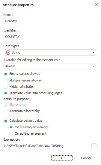 Multiple Values Allowed. The checkbox is deselected by default. If the checkbox is selected for the dictionary element, several values of this attribute can be set. The set of values of this attribute is displayed in a row separated by semicolons. To select several attribute values, the user can set a link by this attribute with the other dictionary containing values. When working with data analysis and report building tools data can be saved to dictionaries with attribute values if this dictionary is specified as a data source and cube dimension, based on which various reports are built.