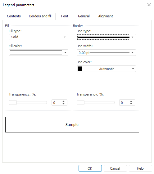 To set up common legend borders and fill, go to the Borders and Fill tab of the Legend Parameters dialog box.