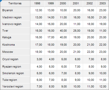 For example of the Series In Rows checkbox selection, built a histogram. As a data source use Volume of Production by Regions, mln. RUB: