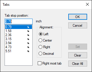 To set up tabulation of text sheets in regular report, use the Tabs dialog box.