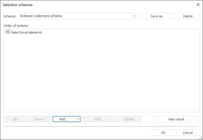 In the Selection Schemas dialog box click the Add button and select the Select Level item in the drop-down list. The Select Level Elements item is added to the Order of Actions list:
