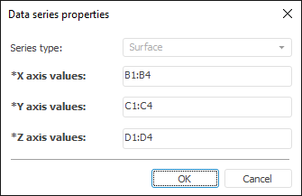 For series of all types, the fields containing the axis values are required. All the settings are entered as ranges.