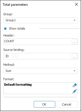 Parameters of totals are set up in the Total Parameters dialog box: