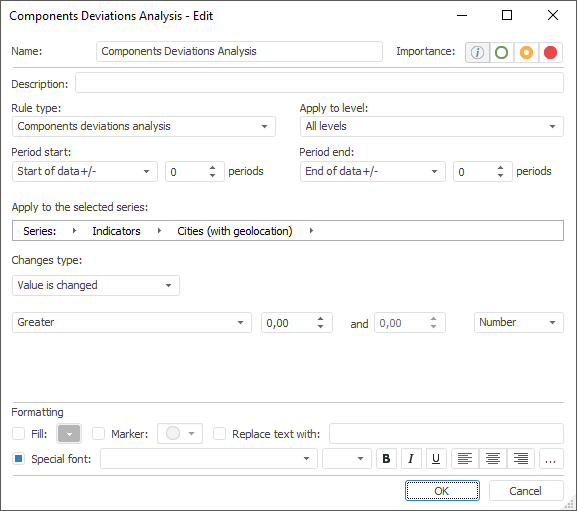 There is the T output series that was calculated by the formula with dependencies, for example, T = Tx + Ty, where Tx and Ty are source series that were the basis for getting the output series. If data is changed in any of the source series (for example, Tx), the output series is changed and it will be equal to T' = T'x +Ty. The operation type recalculates the formula and identifies changes between calculated values and saved values of the T output series, that is it compares T and T'.