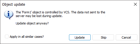 Object update can be skipped or applied. Selecting the Apply in All Similar Cases checkbox applies the selected operation to all objects with the same conflict. Clicking the Cancel button stops the entire update.