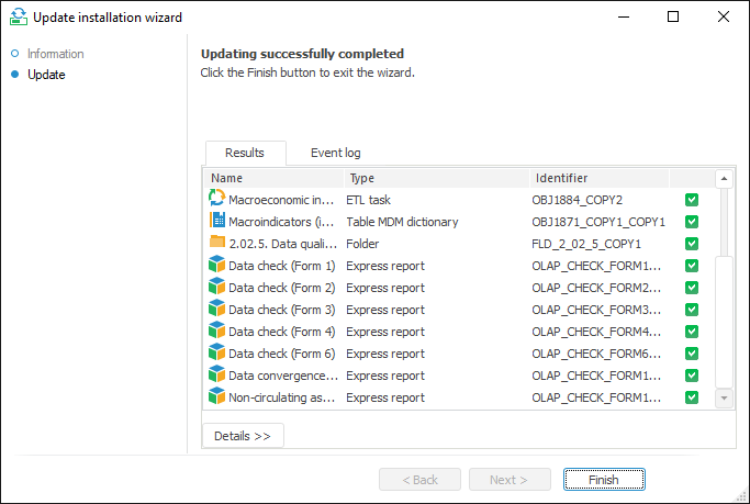 If the After Update group parameters are selected when forming the update, the information message contains the list of operations that will be executed after clicking the Finish button. The list of operations is not displayed if errors have occurred during the update and the Abort Update with an Error Message checkbox is selected in the update options.