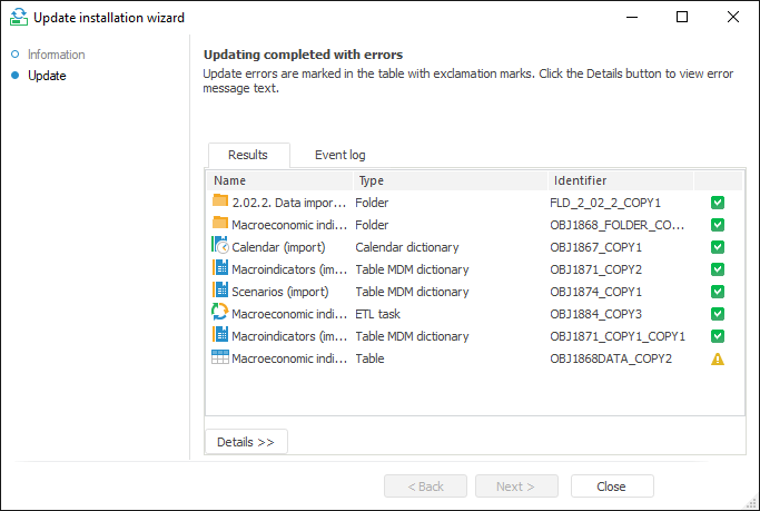 Each object update result is displayed as an icon. Click the Details button to view object update details. The box below displays details for the object selected from the list.