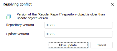 Corresponding object is controlled by VCS. The conflict occurs if the update contains objects added to version control system. To resolve the conflict, click the hyperlink in the Conflict box and confirm the update: