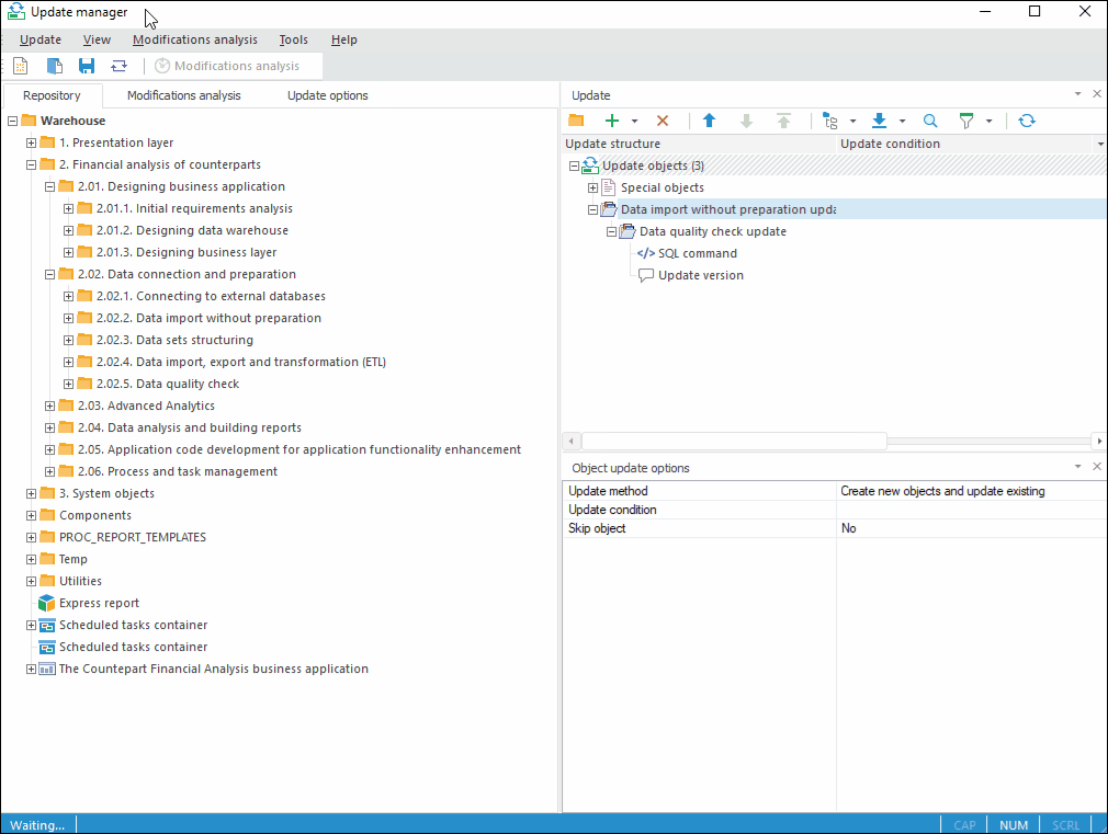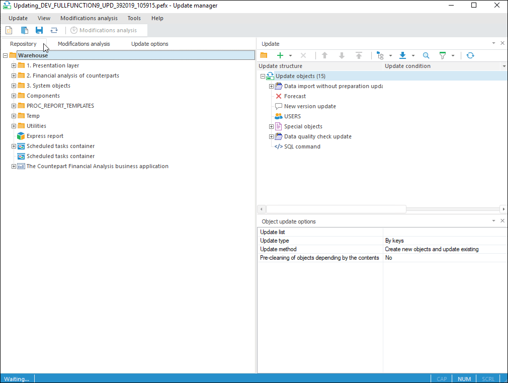 To create an update, open the repository as an administrator who is responsible for synchronization of objects between repositories or application systems synchronization of Foresight Analytics Platform developers and end users, or under the account of Administrators group member account.