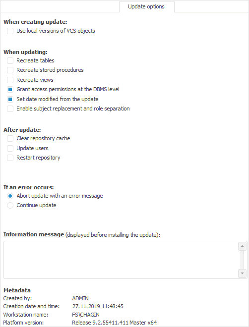 NOTE. Values of options are saved for the current user and are applied automatically when a new update is created.