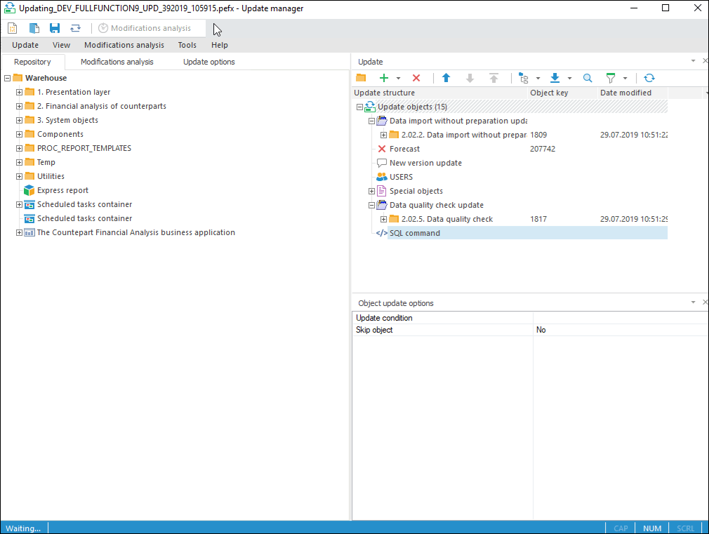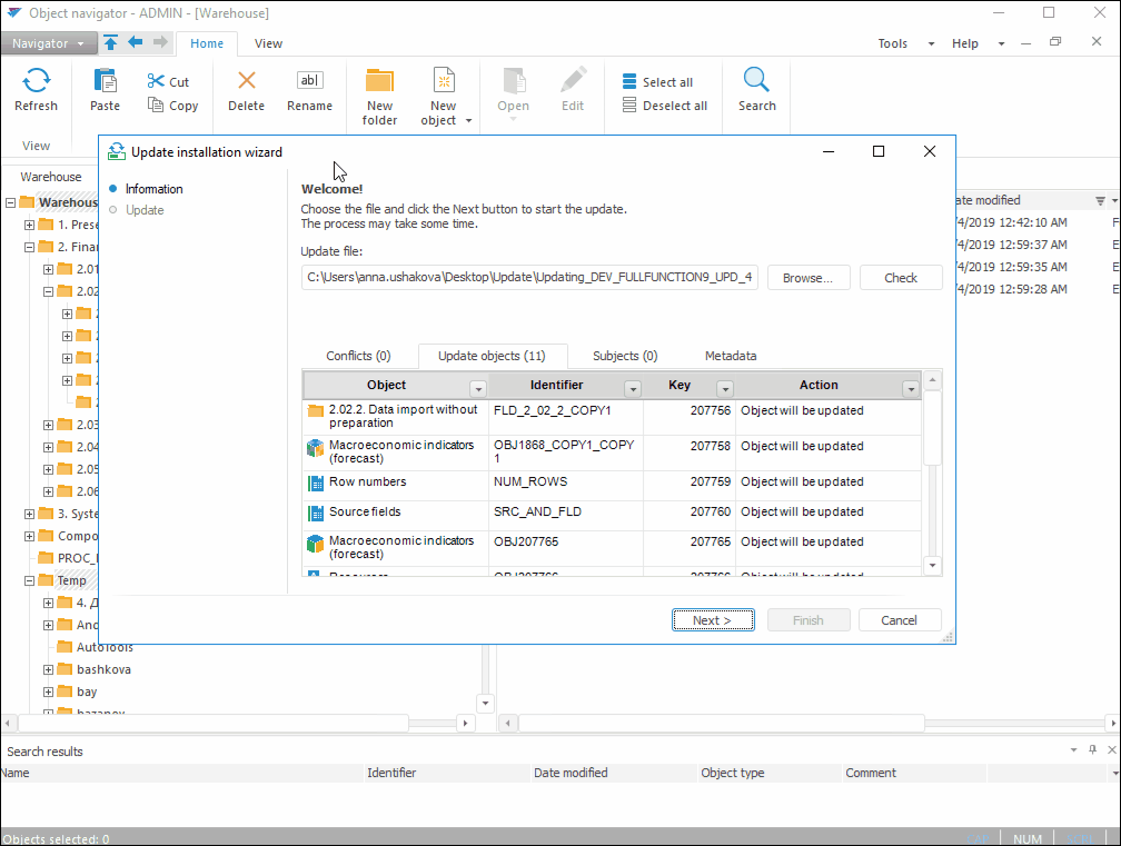 NOTE. When a ready update is opened, the object display on the Update panel for user will depend on the update process on using administrator role separation and various access control methods.