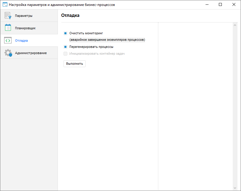 Настройка отладки бизнес-процессов выполняется на странице «Отладка» в окне «Настройка параметров и администрирование бизнес-процессов»: