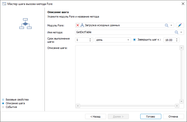 На странице «Описание шага» для шага «Вызов Fore-метода» определите: