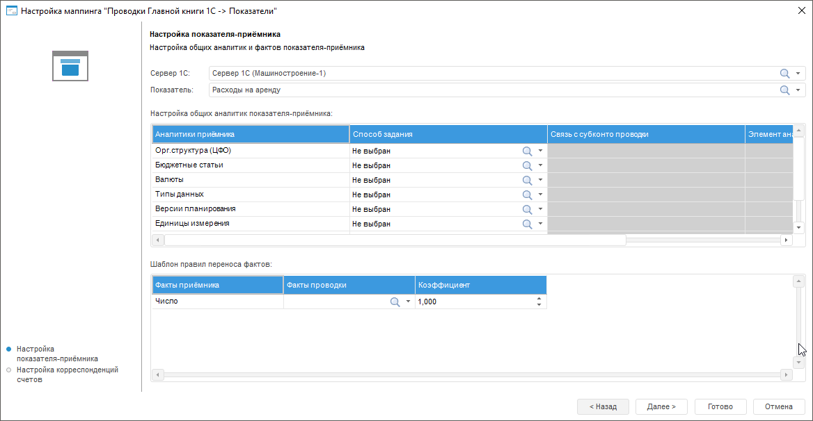 Настройка корреспонденций счетов. На странице выполняется настройка частных аналитик показателей приёмника для настройки корреспонденций и специфических правил переноса фактических данных.