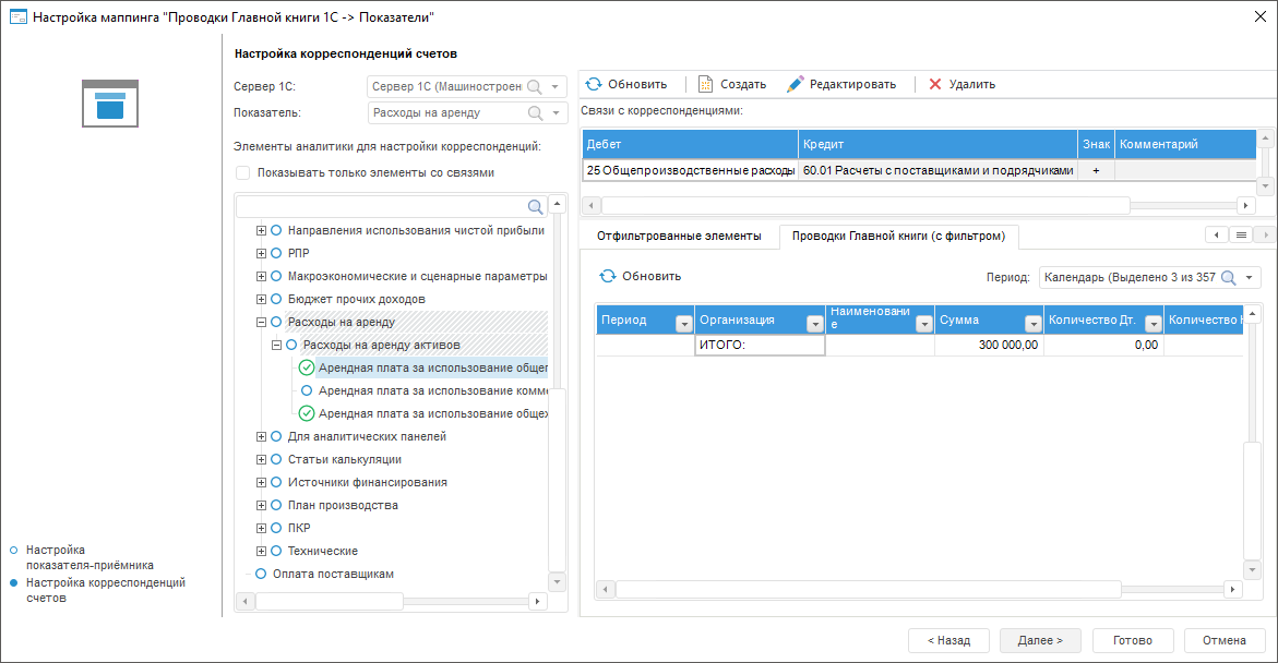 маппинга «Проводки Главной книги 1С -> Показатели»